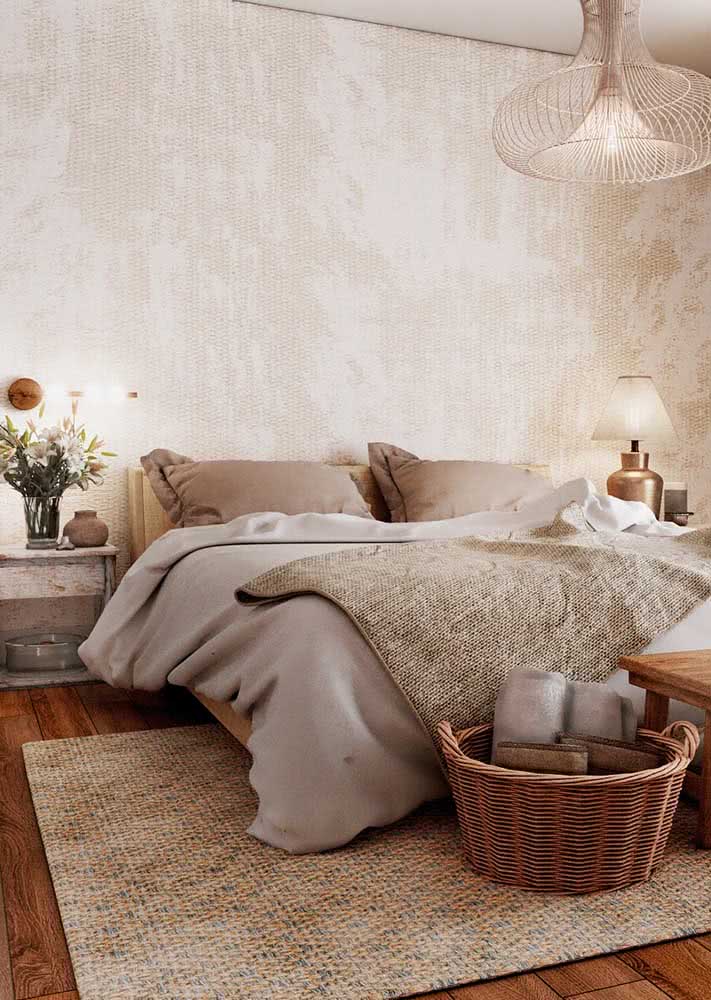 Imagem 1 – Papel de parede para quarto de casal com estampa neutra e delicada.