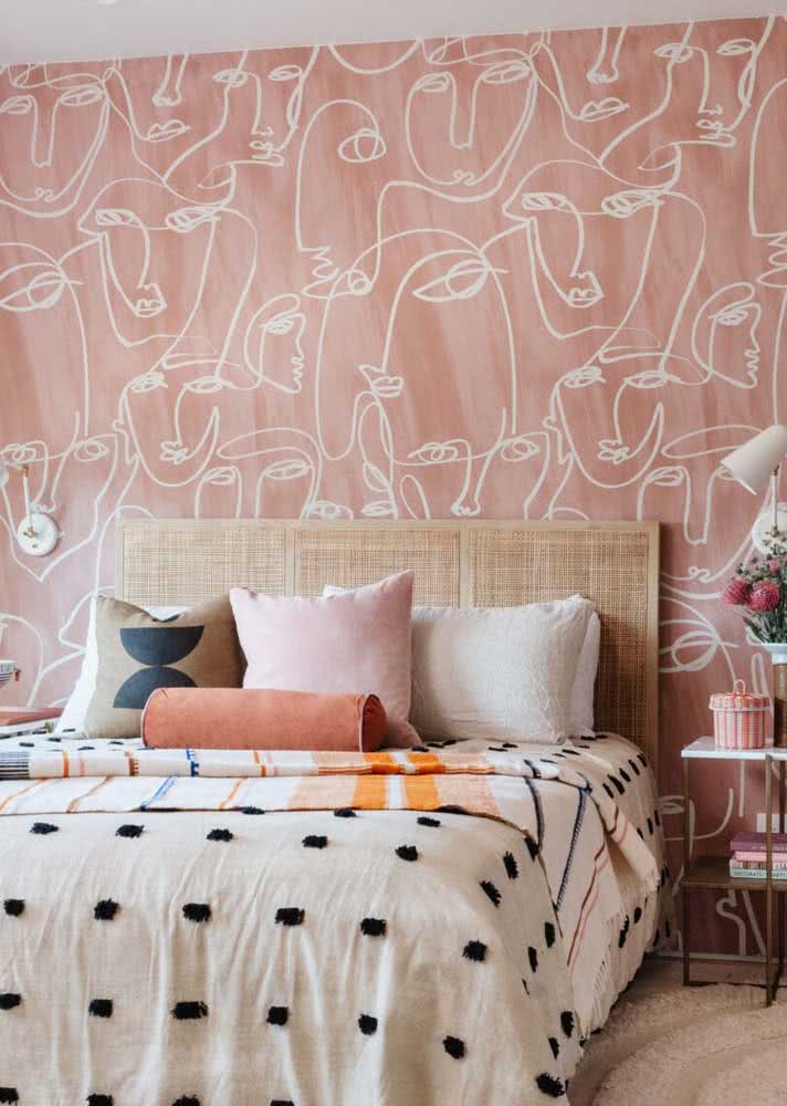 Já pensou substituir a cabeceira de cama tradicional por papel de parede? Nesse caso, o papel deve ser colocado na altura que ficaria a cabeceira.