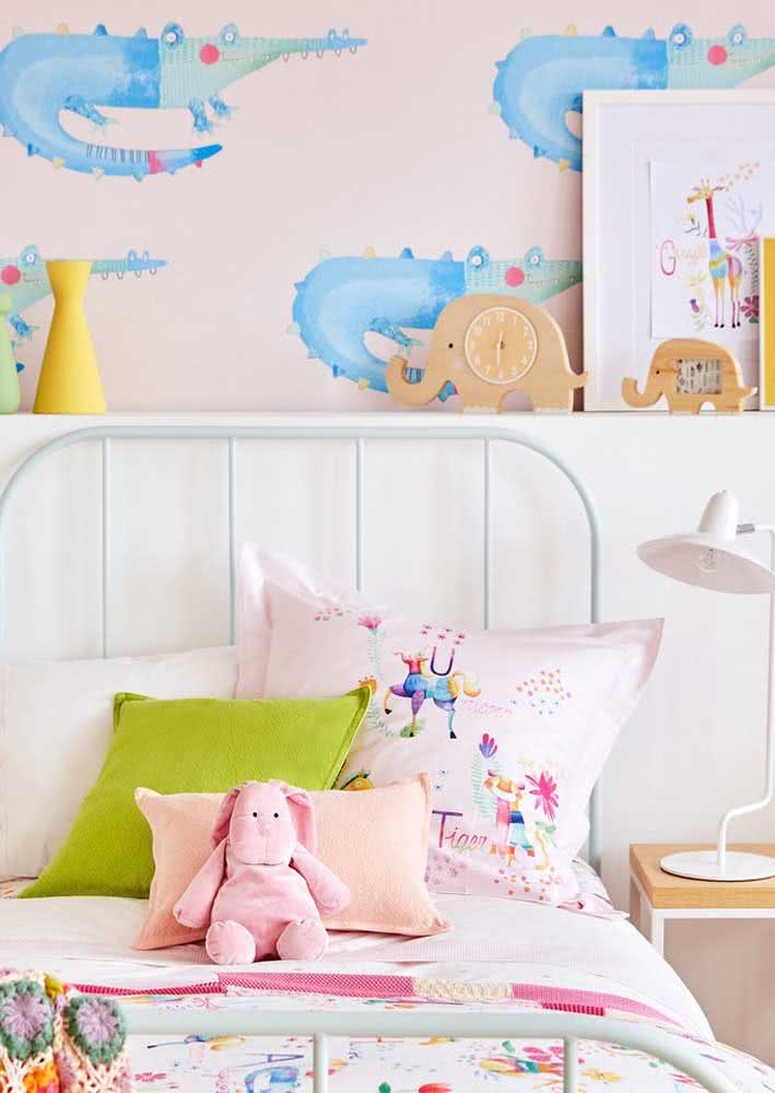 Imagem 38 – Já o papel de parede para quarto de menina traz estampas de jacaré.