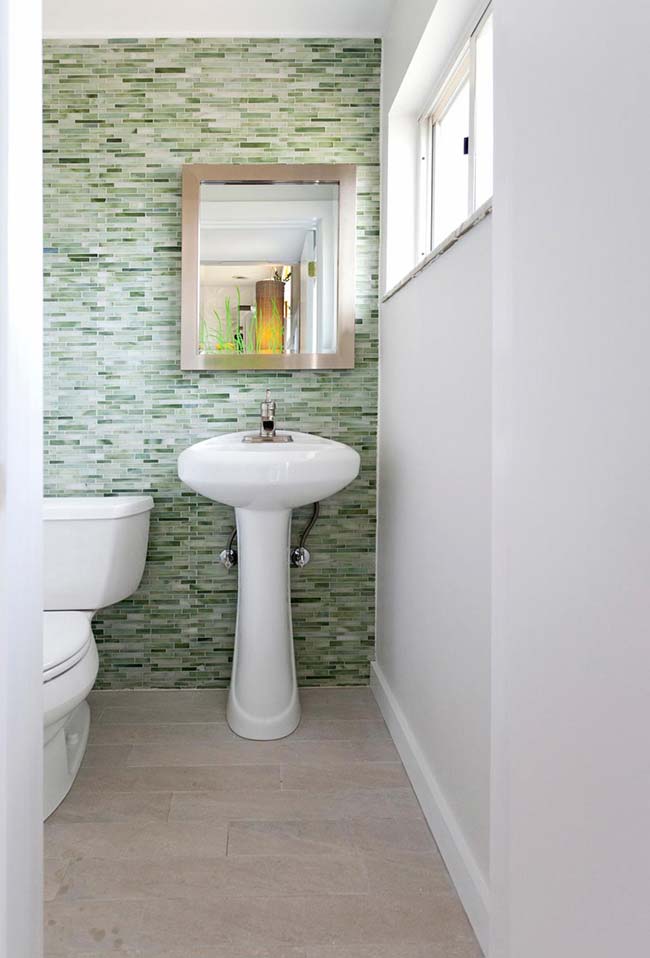 Imagem 30 – Para o banheiro branco, pastilhas de vidro em três tons de verde diferentes.