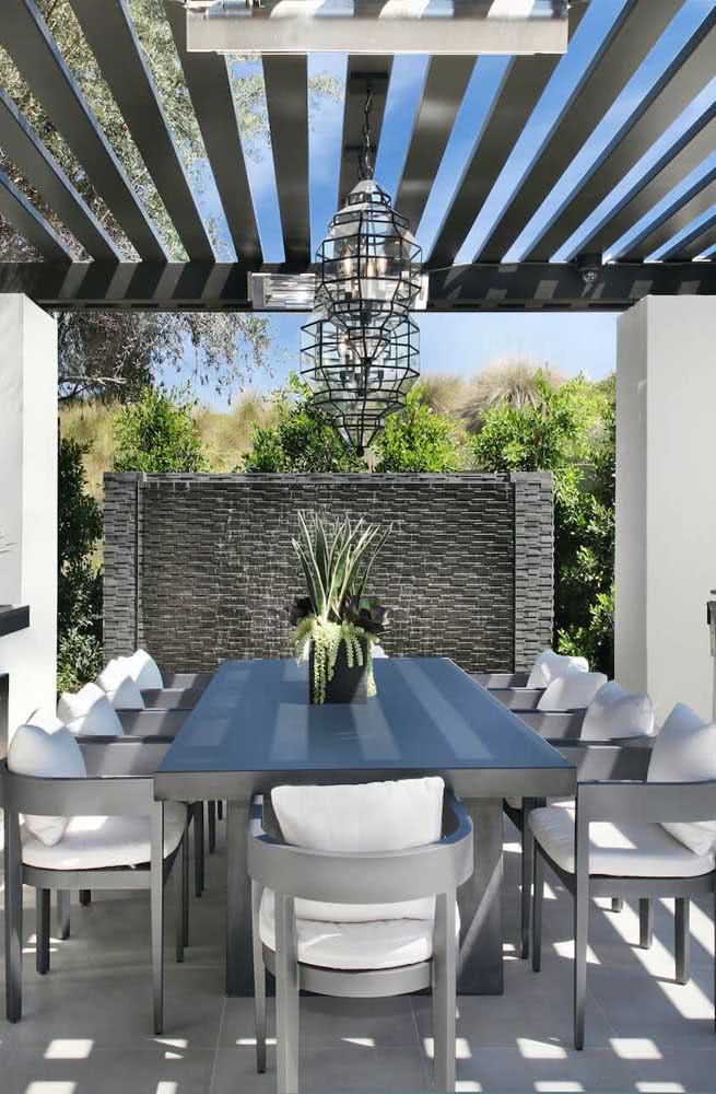 Imagem 1 – Pendente para área gourmet externa em estilo industrial e tons de cinza para seguir a mesma paleta da decoração.