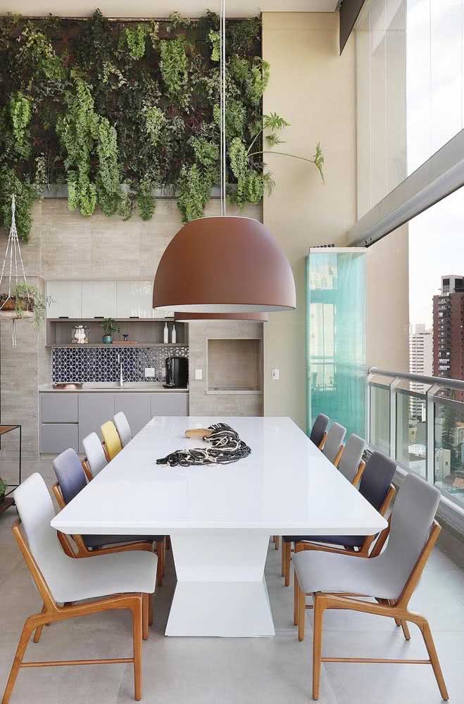 Imagem 18 – Já quem pretende uma área gourmet moderna e elegante, escolha um modelo de pendente na mesma paleta de cores da decoração.