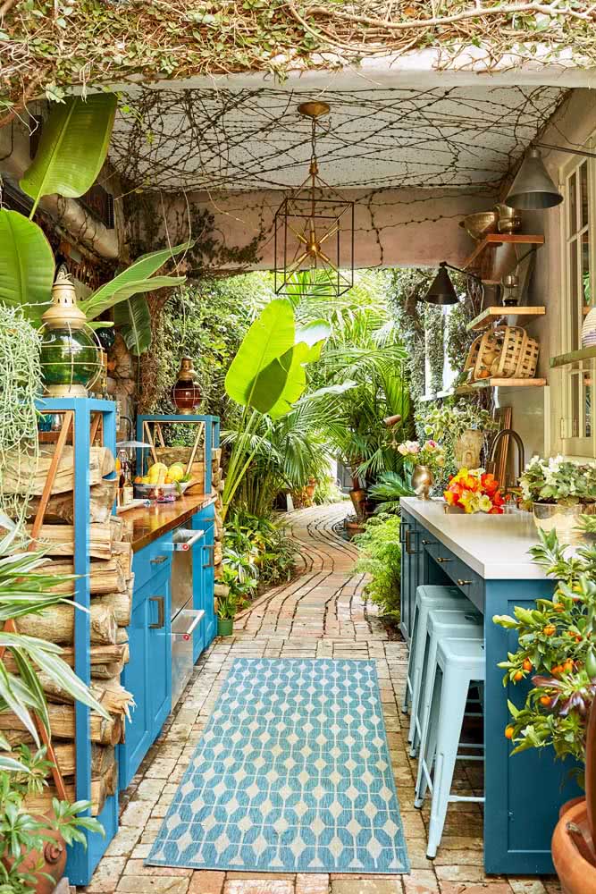 Imagem 17 – Aqui, o pendente rústico de palha caiu como uma luva na decoração rústica da área gourmet externa.