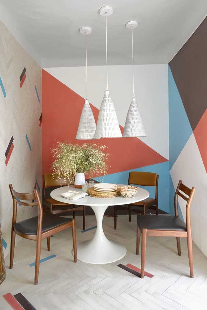 Imagem 37 – Sala de jantar sem graça? Faça uma pintura geométrica na parede.