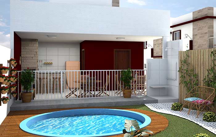 Por ser um modelo mais simples, o entorno deve ser mais caprichado com plantas e um piso bonito. Esses elementos deixarão o espaço mais acolhedor!