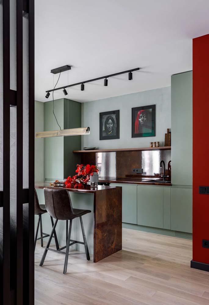 Imagem 54 – Cozinha minimalista com piso que imita madeira.