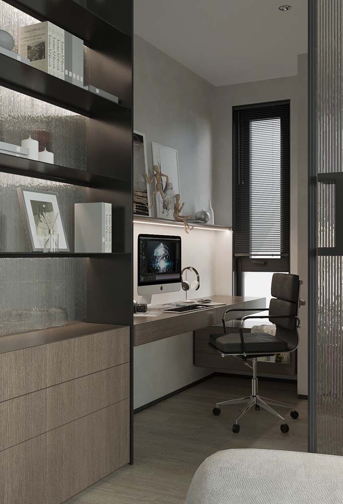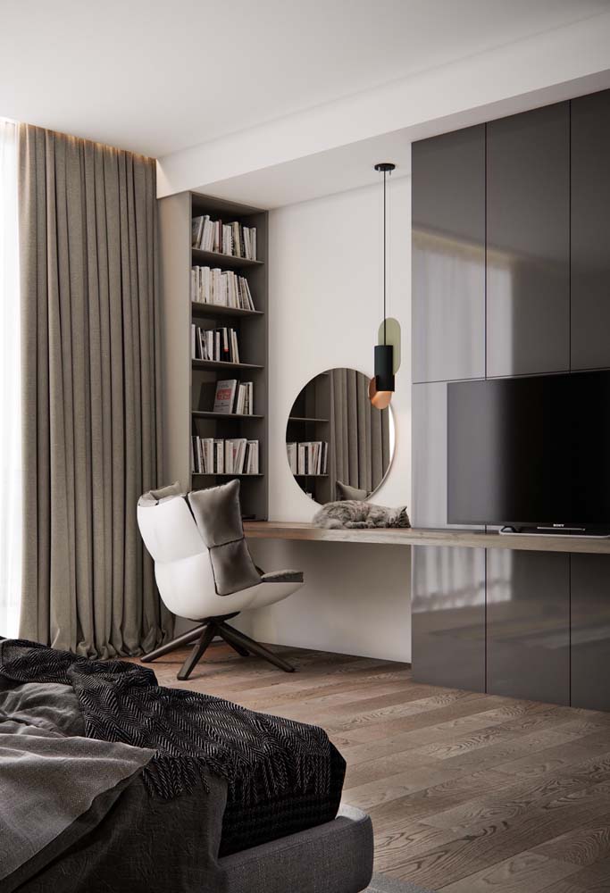 Imagem 25 – Quarto e home office com piso que imita madeira.