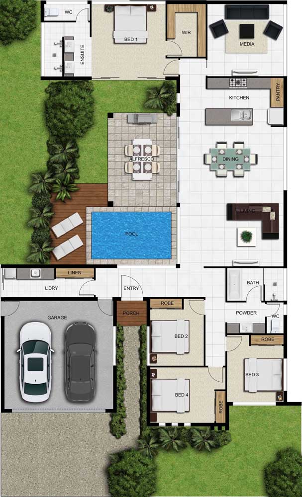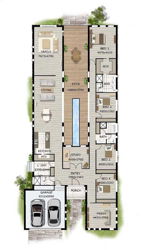 Imagem 47 – Modelo de planta de casa grande com piscina, garagem para carros e barco, quatro quartos e living externo.