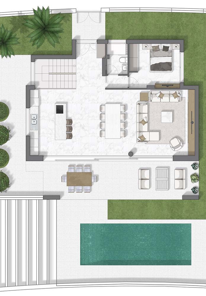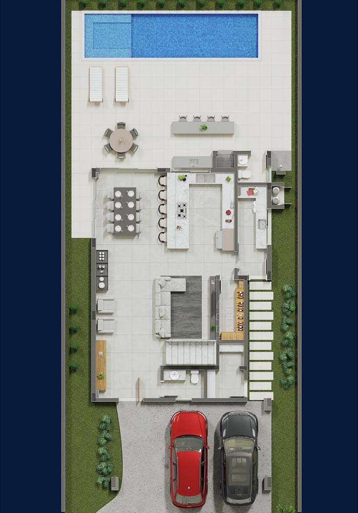 Imagem 26A – Primeiro pavimento de uma planta de casa com piscina, garagem e sala de estar integrada a sala de jantar, além da suíte.