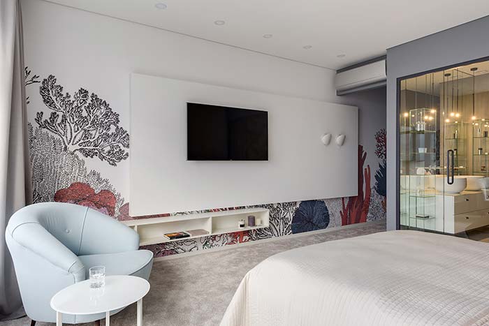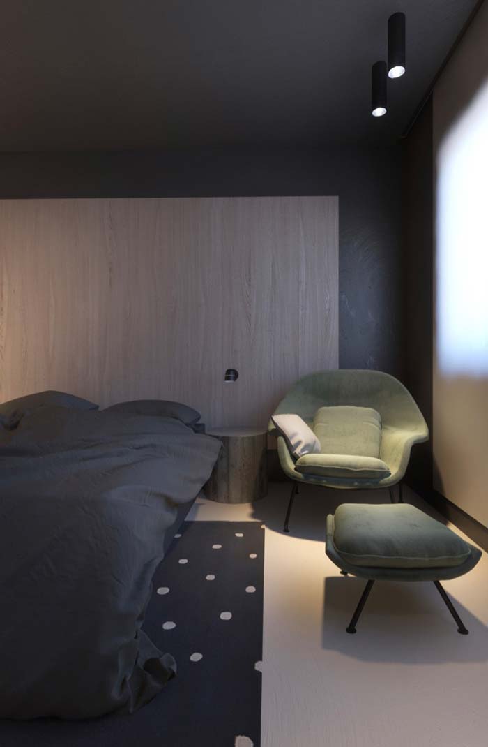 Imagem 54 – Mais um exemplo de poltrona combinando com as escolhas de materiais e tecidos do quarto.