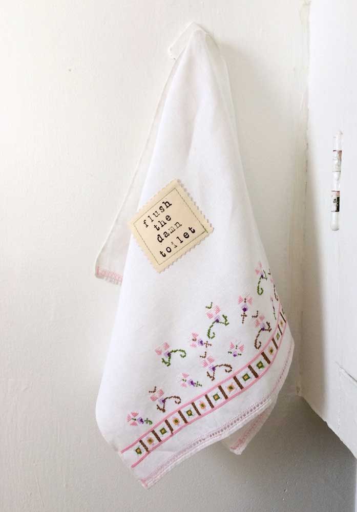Imagem 40 – As tradicionais toalhas de banho bordadas em ponto cruz, achou que elas iam ficar de fora?