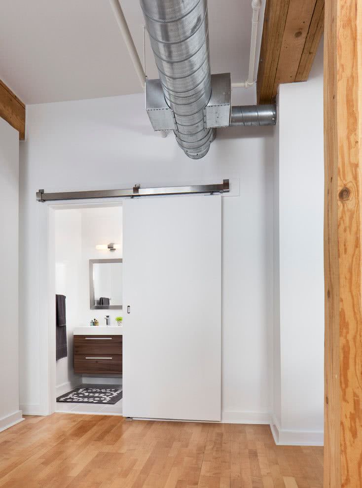 Hoje em dia, muitos banheiros de apartamentos tem as batentes estreitos e uma das formas de mudar a cara deste ambiente é trocando a porta tradicional pela porta de correr. Desta forma, o vão de passagem pode ser maior e pode-se aproveitar o espaço interno antes ocupado pela porta aberta. Deixar os trilhos aparentes é opcional, de acordo com o seu gosto e do projeto.