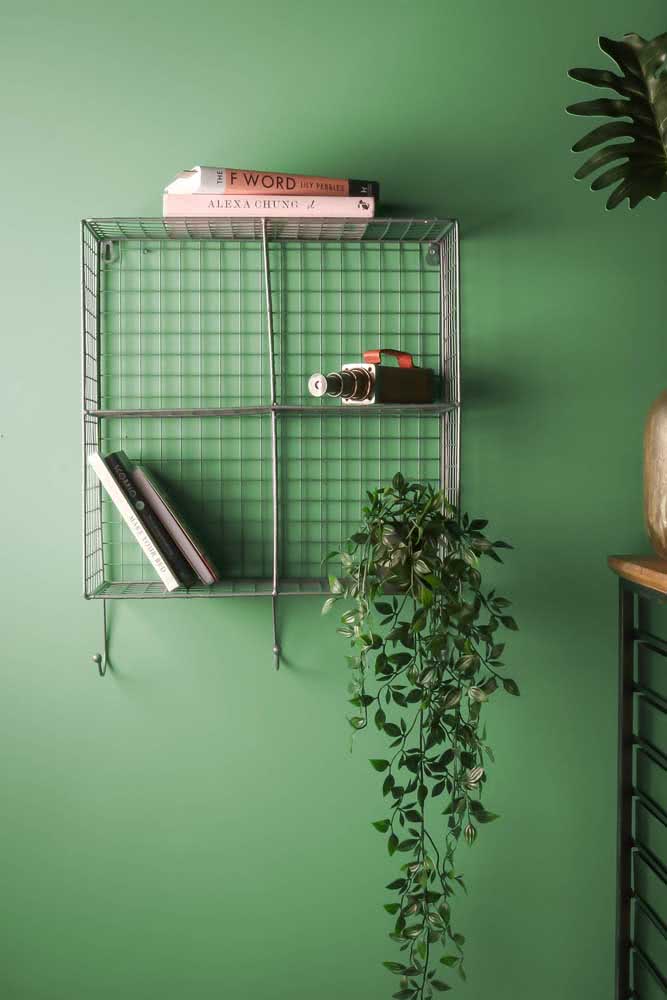 Imagem 22 – Aqui, a faixa de pintura verde ajudou a destacar a prateleira industrial feita de trilhos ajustáveis.