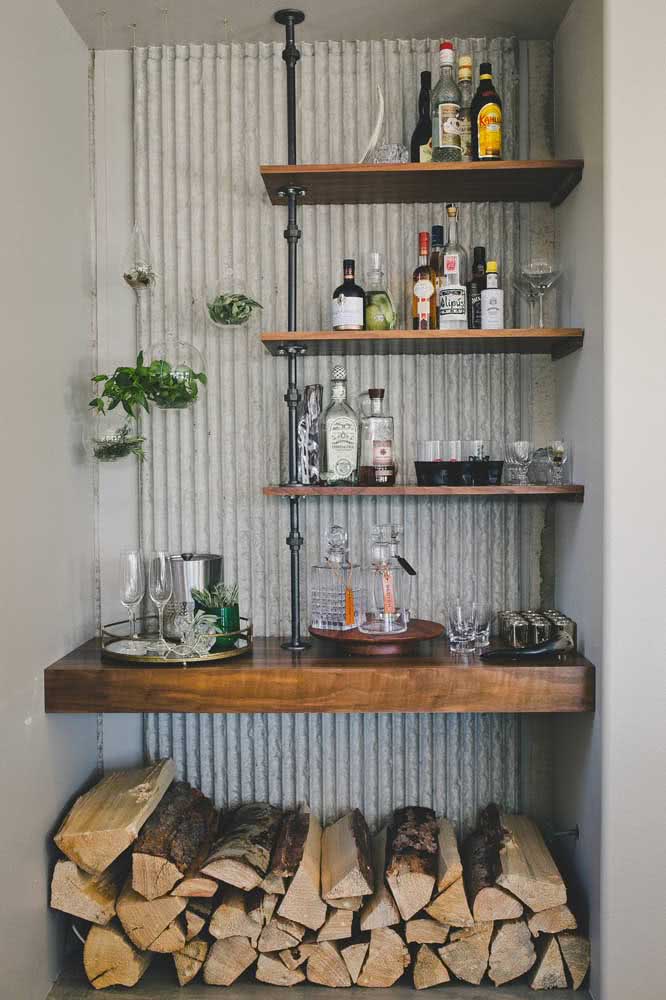 Imagem 12 – Prateleira industrial para o barzinho. Repare que aqui, a madeira também deu lugar para o vidro.