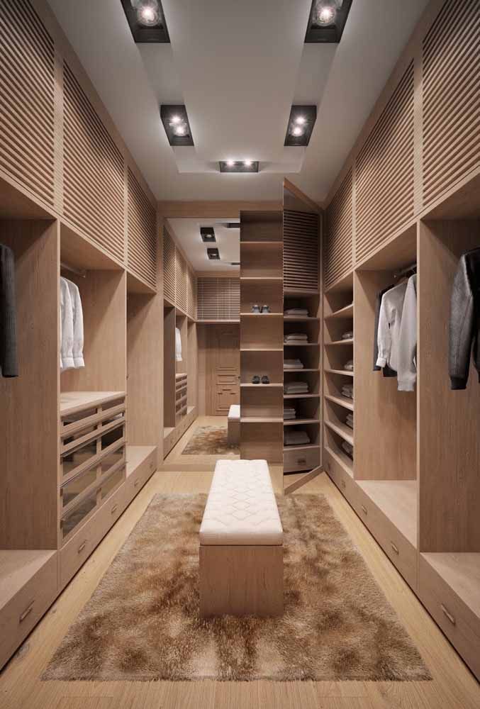 Imagem 18 – Para acompanhar o formato do closet, um puff baú retangular