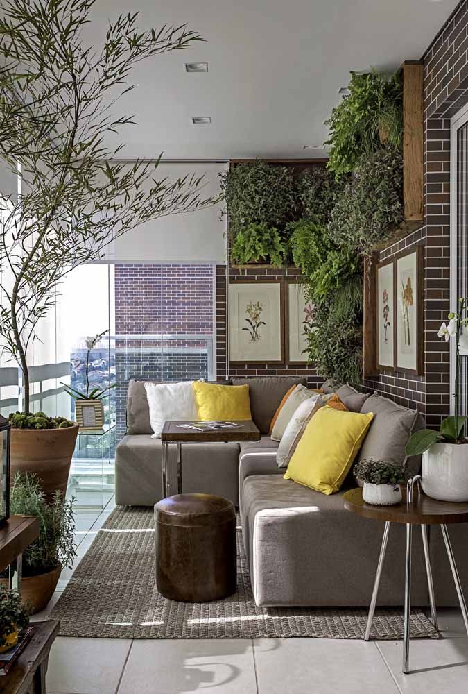 Imagem 39 – A varanda acolhedora apostou no uso de um pequeno puff baú de couro