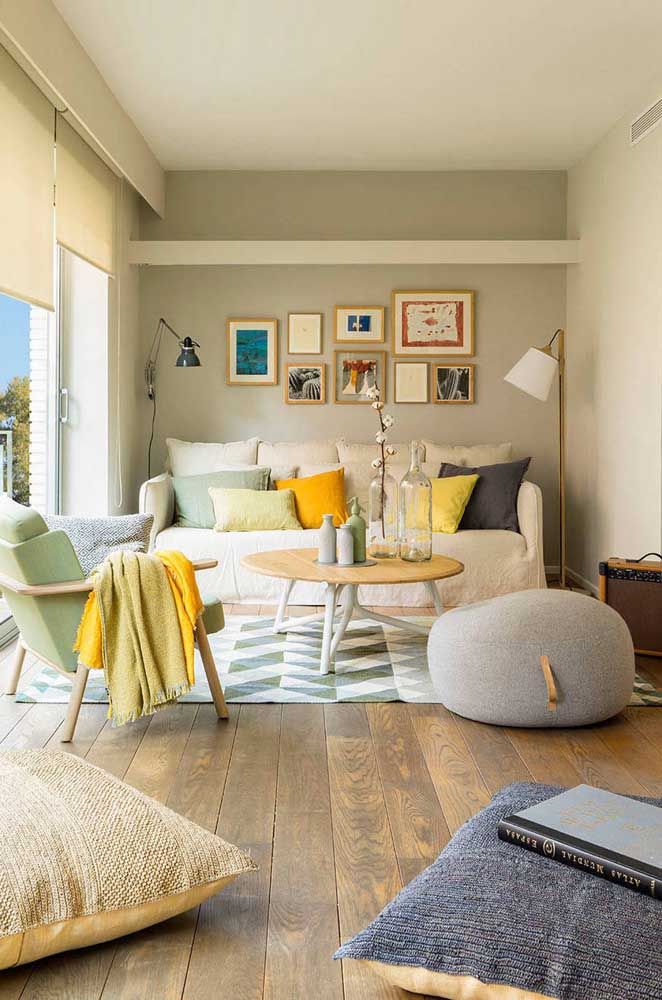 Imagem 13 – Uma sala com puffs para escolher: tem redondo, com pé, sem pé, de tecido, madeira e o que mais conseguir encontrar.