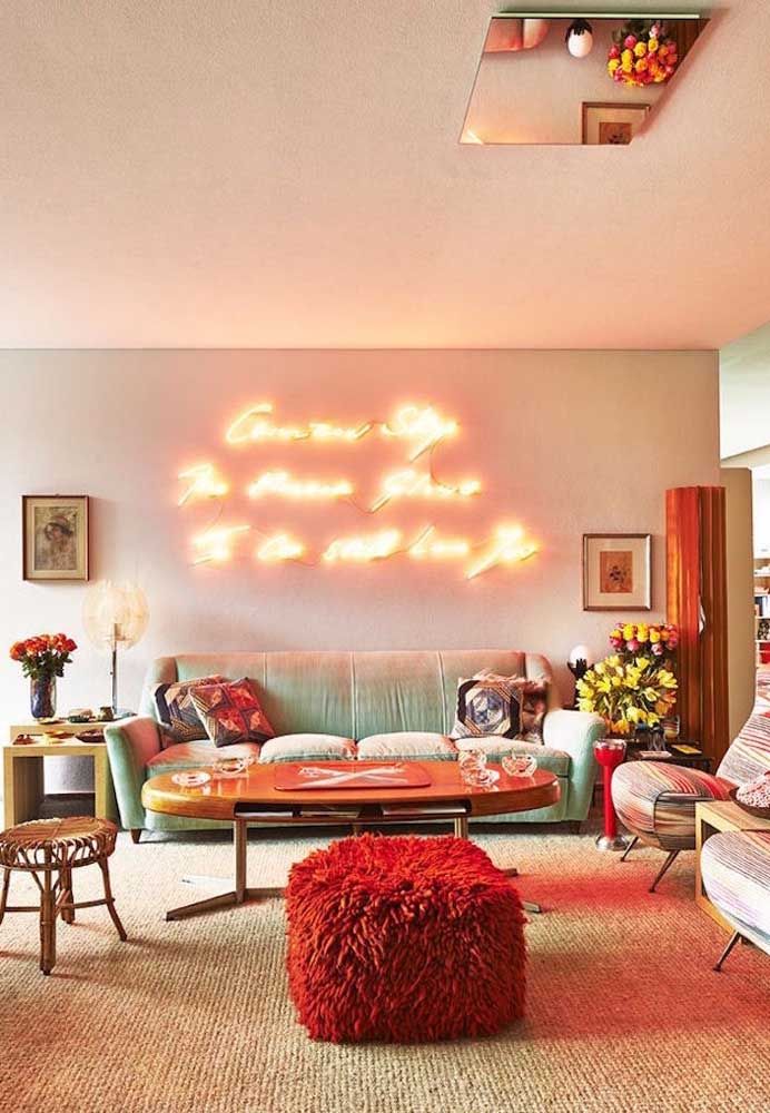 Imagem 5 – Um modelo quadrado, peludinho e vibrante de puff para combinar com a energia alto astral dessa sala.