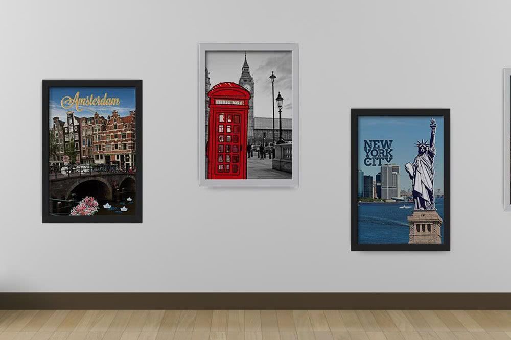 Entre os diversos estilos, os mais procurados são os quadros coloridos com frases, com arte abstrata, vintage e até mesmo posters emoldurados: