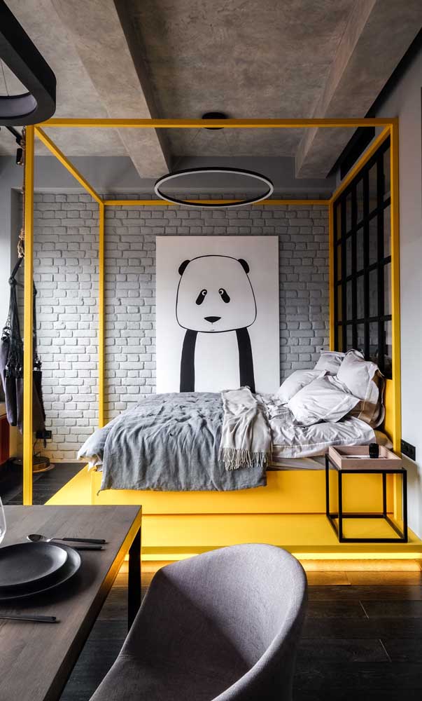 Imagem 36 – Já aqui nesse quarto de parede preta, nada mais certo do que apostar no uso de quadros de fundo branco.