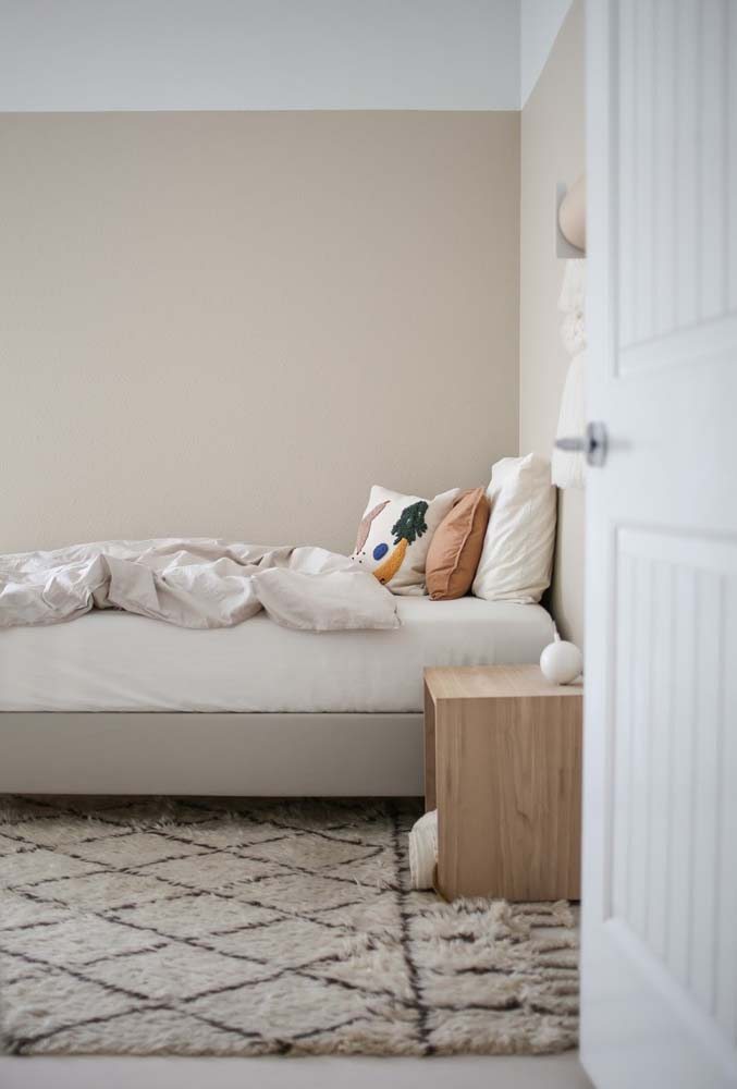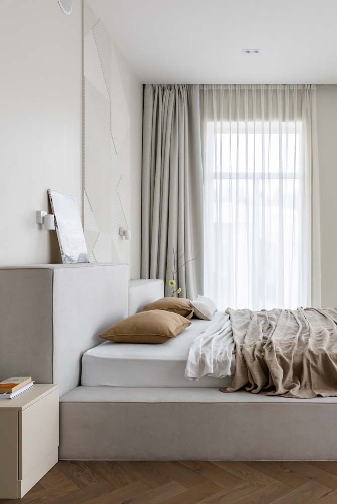 Imagem 25 – Até a roupa de cama segue o estilo clean e neutro da decoração.