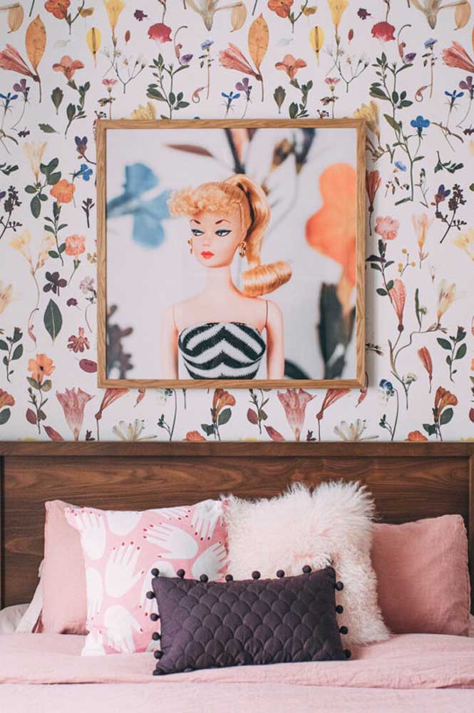 Imagem 20 – Papel de parede e detalhes delicados dividem espaço com o quadro da Barbie.