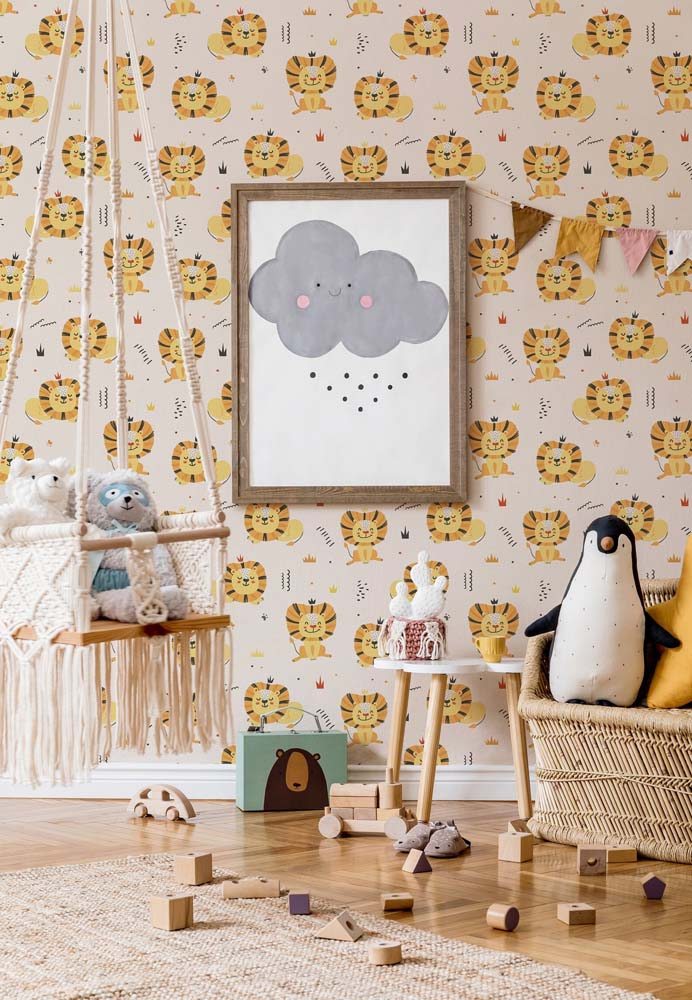 Imagem 30 – Um papel de parede lúdico que deixou este quarto super fofo e charmoso.