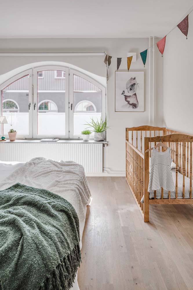 Imagem 34 – O berço simples de madeira e tecido fica encostado na parede próxima à cama neste um ambiente simples e que transborda calmaria.