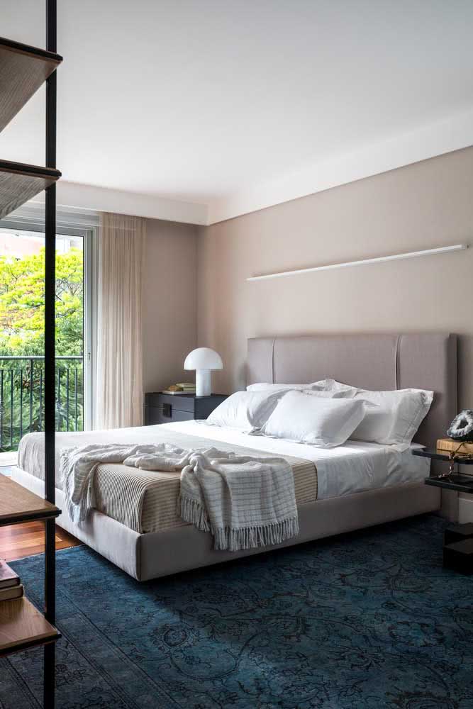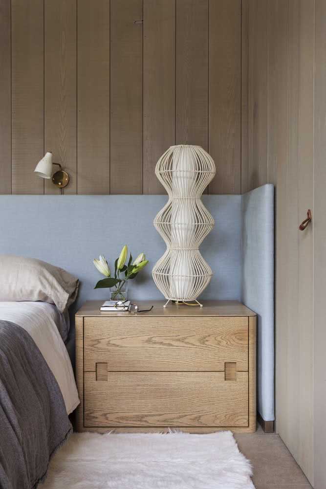 A cereja do bolo do quarto de casal com cores neutras é a iluminação.