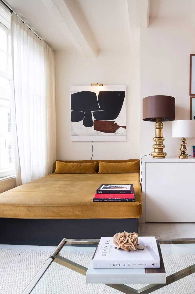 Para acrescentar um ponto focal ou de vivacidade ao quarto, experimente, por exemplo, trazer alguns itens em tons metálicos, como o dourado e o rosé gold. Eles mantem a neutralidade ao mesmo tempo em que glamourizam a decoração.