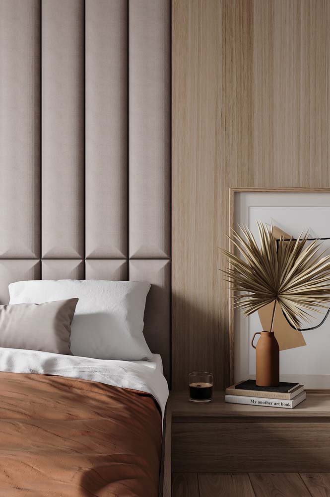 Imagem 11 – Parede com textura de cimento queimado, cabeceira de tecido marrom e objetos na cor preta.