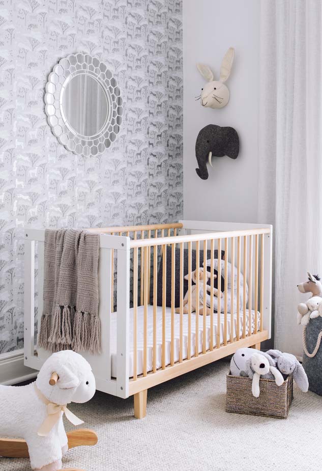 Imagem 15 – Quarto de bebê com papel de parede com fundo branco e estampas grandes, porém bem espaçadas, deixam o ambiente leve e fluido.