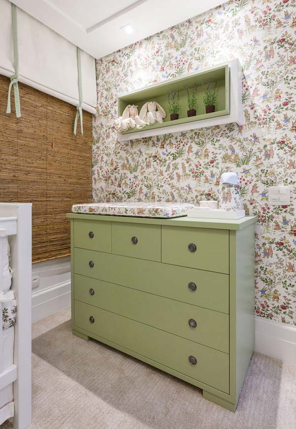Imagem 56 – Floral e alegre: papel de parede é o grande destaque desse quarto e para combinar com ele, uma cômoda verde.