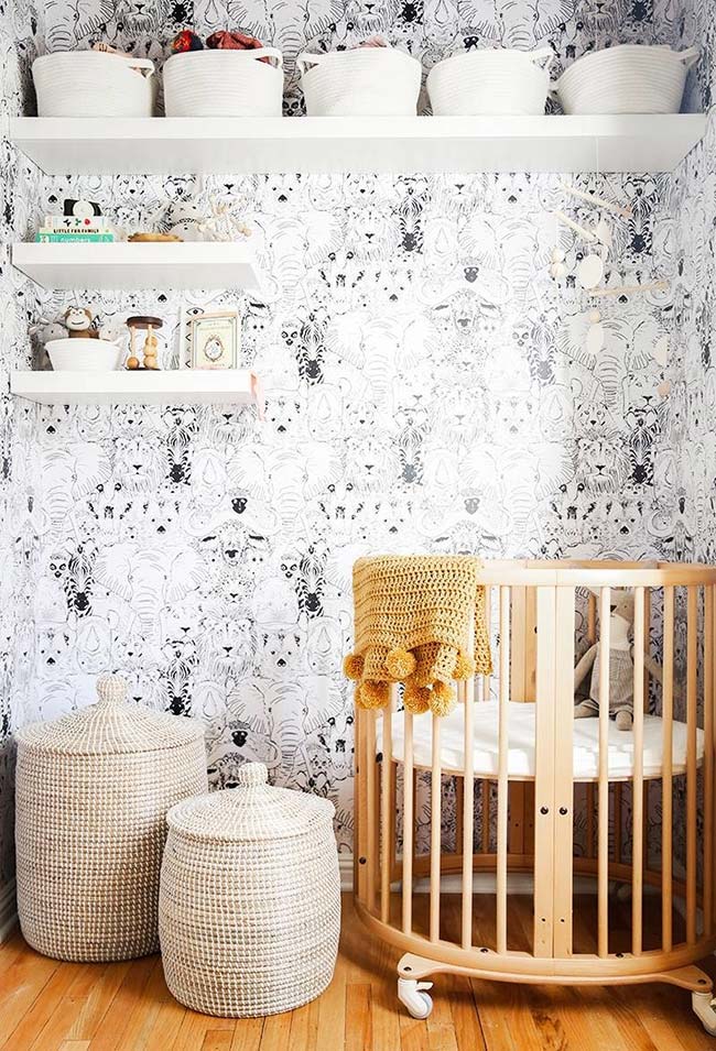 Imagem 58 – Nesse quarto de bebê, o papel de parede foi complementado com a presença das prateleiras brancas.