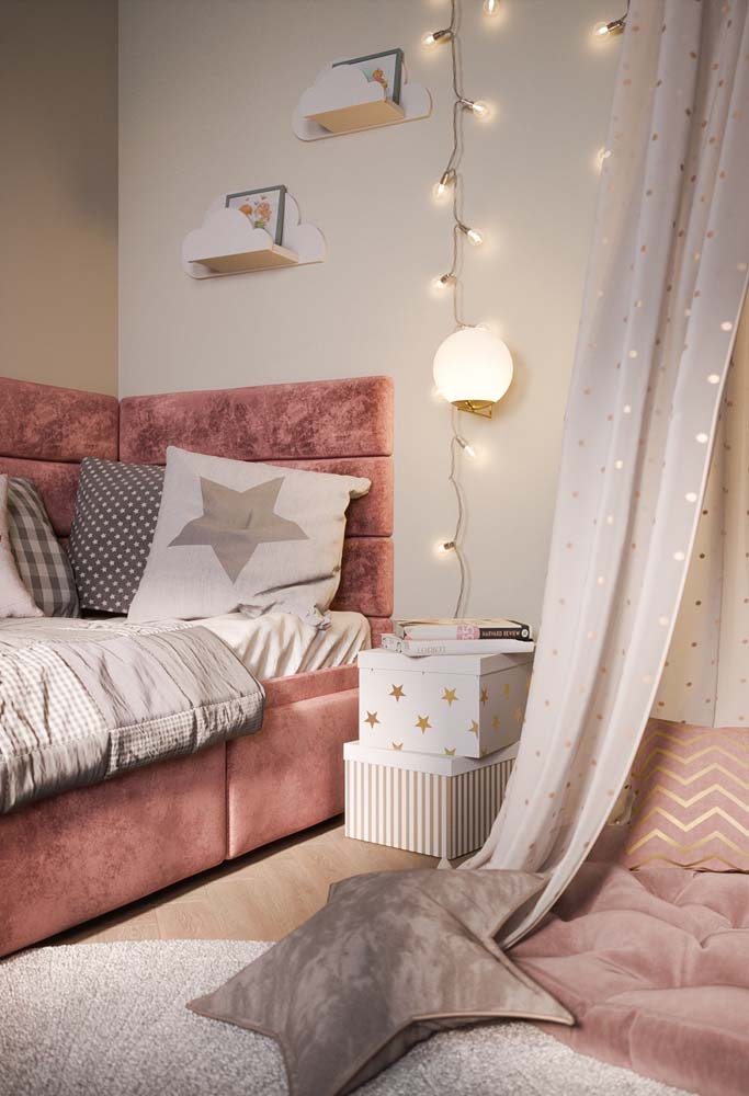 Imagem 13 – Projeto de quarto lúdico cheio de conforto com dossel e cama com cabeceira estofada de veludo.