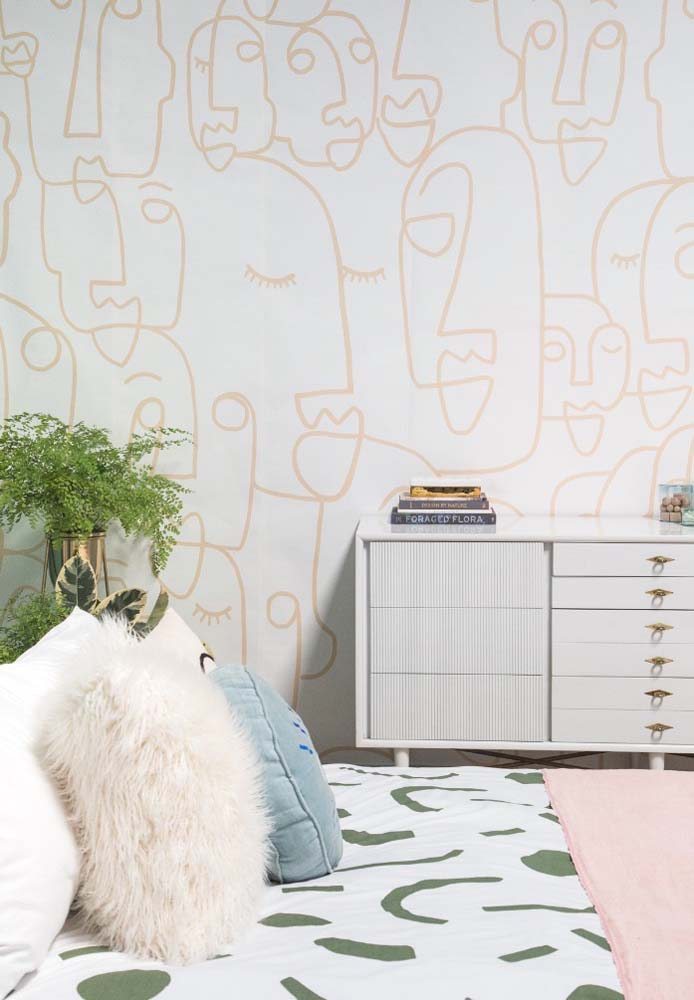 Imagem 4 – Parede com ilustração personalizada na parede, cama pequena moderna com cabeceira lateral em estofado apoiado em suportes metálicos.