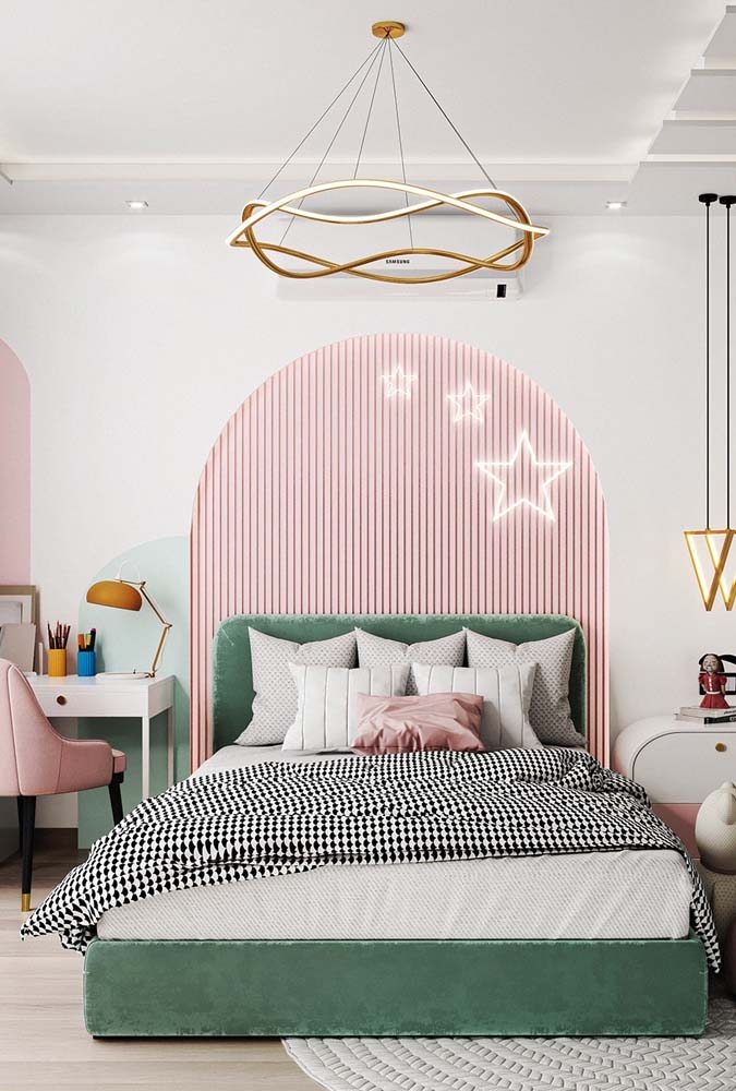 Imagem 21 – Suite de estrela: mix de rosa e verde no quarto glamuroso e luxuoso.