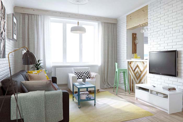 Imagem 24 – Parede de tijolinhos brancos ganhou um rack azul e cinza; para fechar a decor um tapete preto e branco.