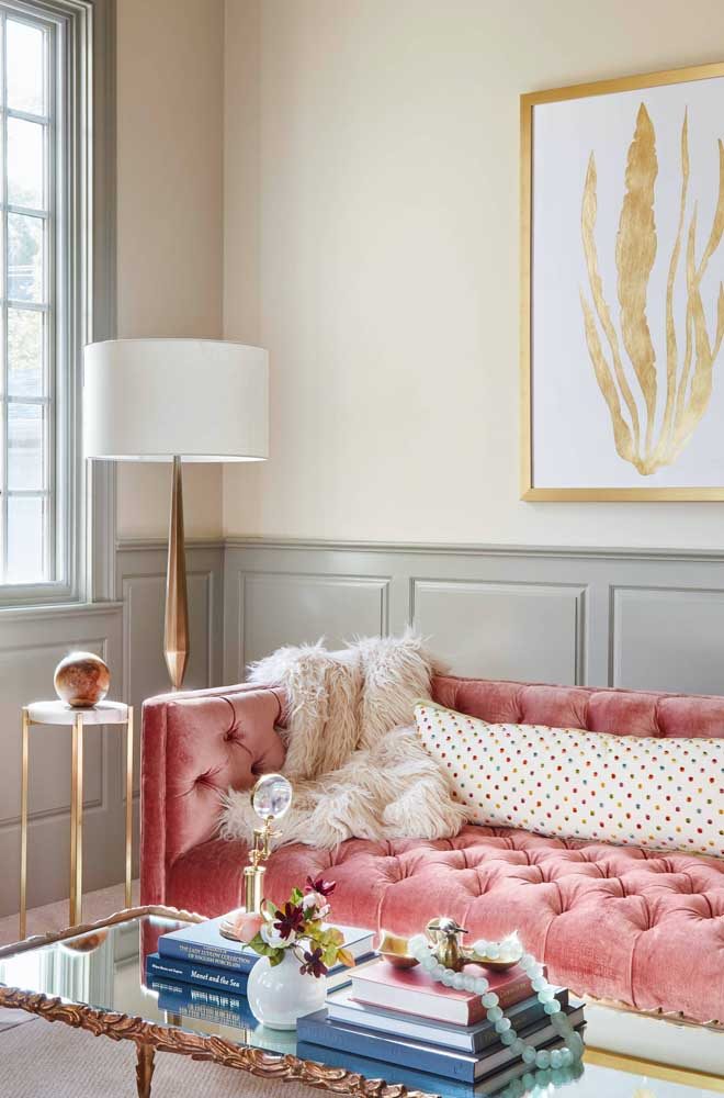 Imagem 24 – Sofá rosa millennial combinado com detalhes dourados é tudo que uma sala precisa