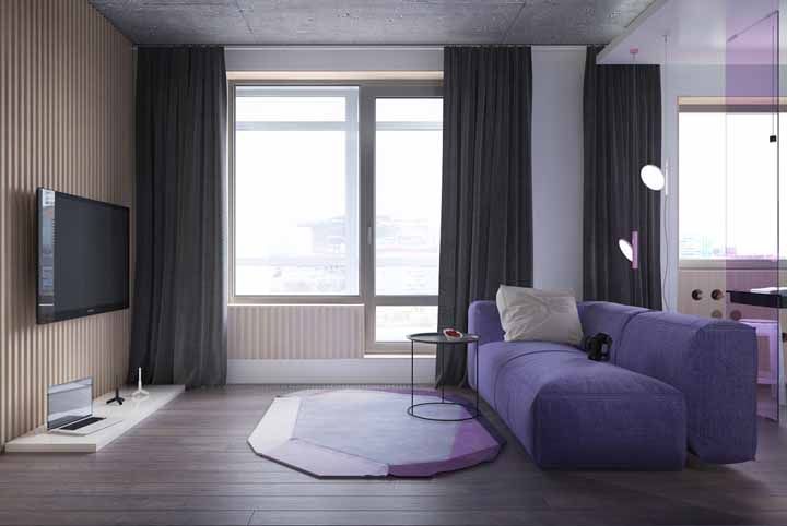 Imagem 48 – Para o sofá roxo ser o centro das atenções, a opção foi deixar a parede cinza.