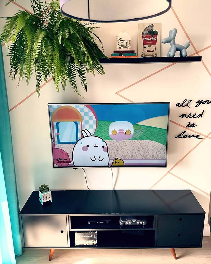 Imagem 74 – Sala de TV decorada com estilo jovial e samambaia.