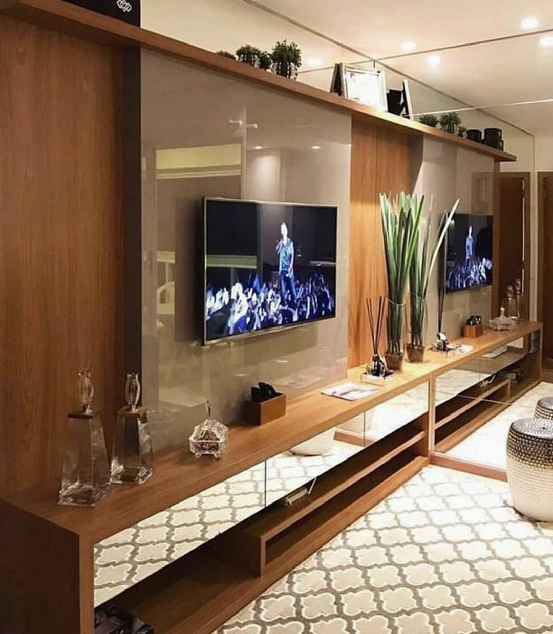 Imagem 115 – Sala de TV decorada com painel de madeira e rack espelhado