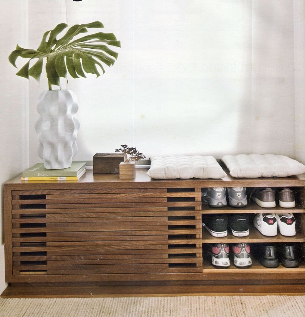 Um aparador ou rack na sala pode esconder os sapatos de uma forma organizada e discreta.