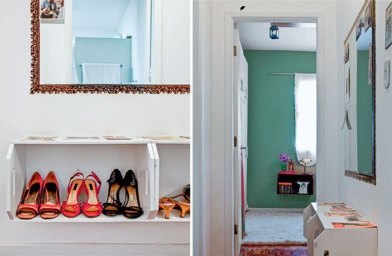 Para áreas menos visíveis, como os pequenos nichos desta sala, a alternativa foi apoiar os sapatos e deixá-los a vista no aparador.