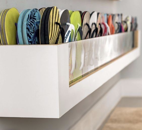 Qualquer prateleira é bem-vinda na decoração! Você pode até decorar sua parede com essa sapateira de parede.