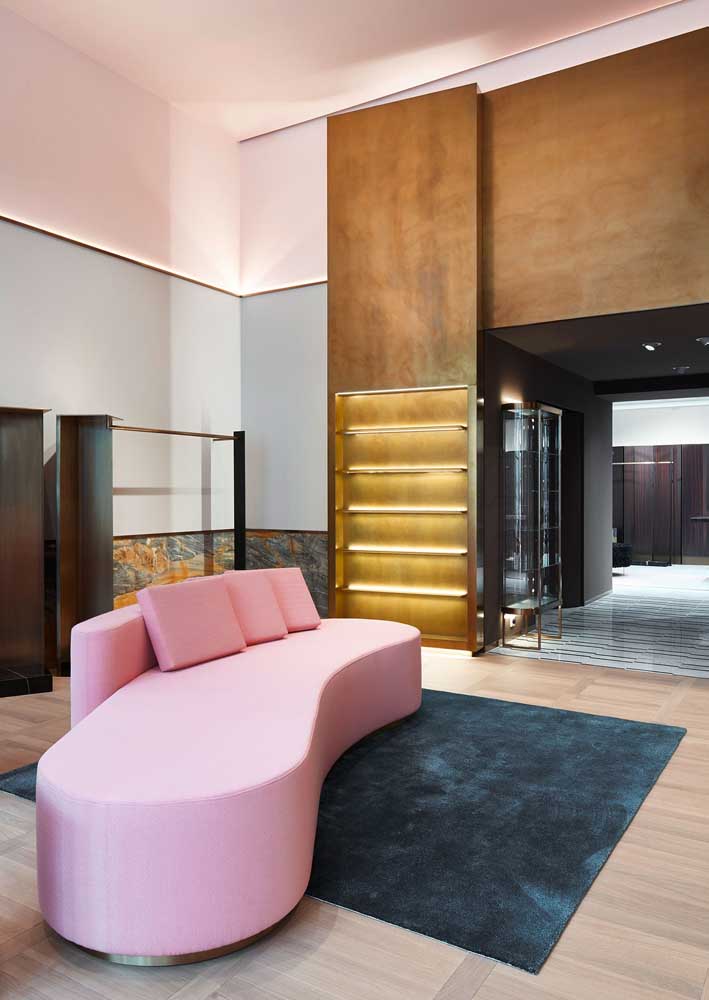 Imagem 3 – O rosa também tem vez por aqui. Dessa vez, o sofá curvo pequeno combina com o tom da parede.