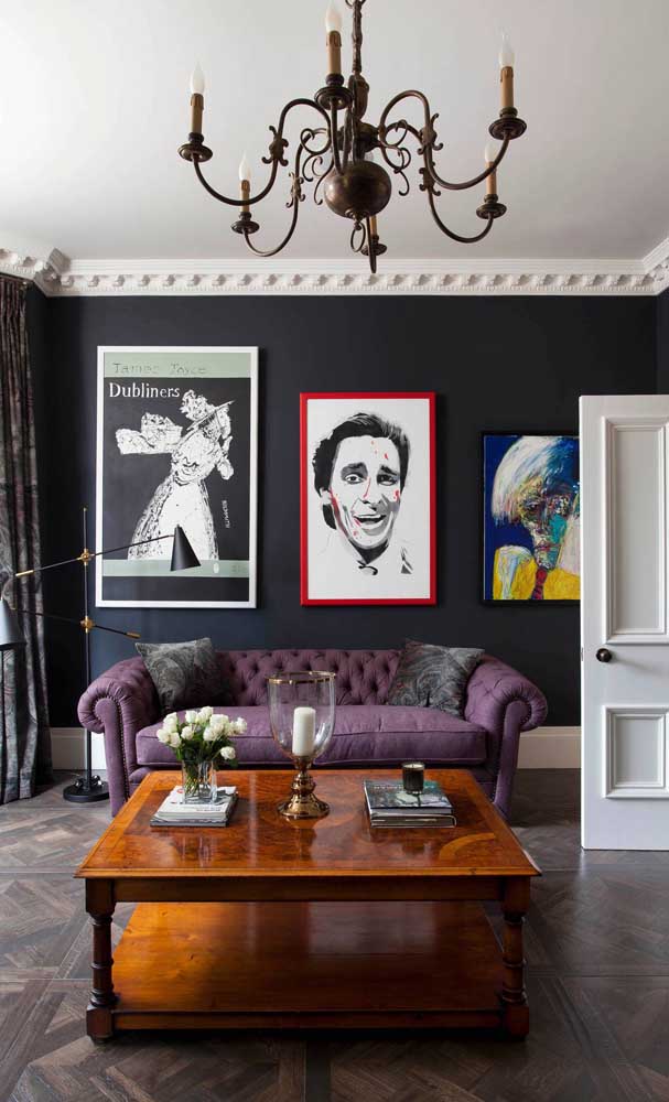 Imagem 34 – Para quem não tem medo de ousar, vale essa sugestão de sofá roxo com paredes pretas.