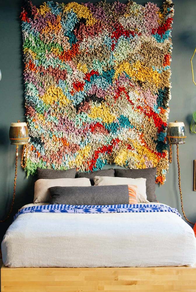 Imagem 50 – E para finalizar, uma tapeçaria de parede bem grande, colorida e com muita textura usando a técnica looping acima da cama.