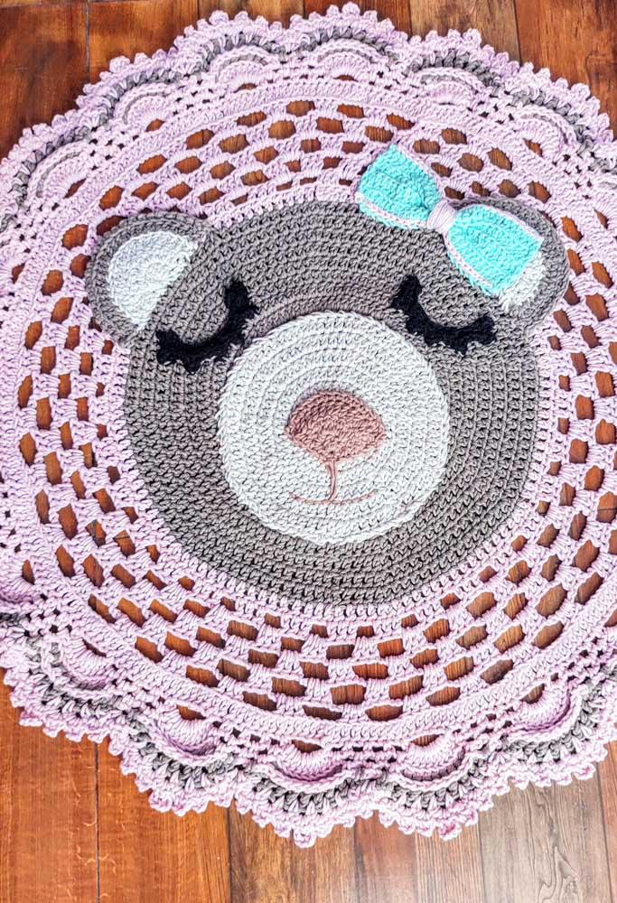 Imagem 19 – Tapete de crochê infantil feminino com uma carinha fofa de ursinho.