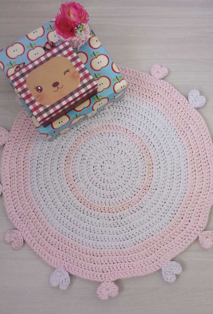 Tapete de crochê infantil redondo: O tapete de crochê infantil redondo é um dos mais populares e utilizados. O formato delicado combina super bem com quartos infantis. O tapete redondo também é perfeito para a criança brincar. Nesse caso, quanto maior, melhor.